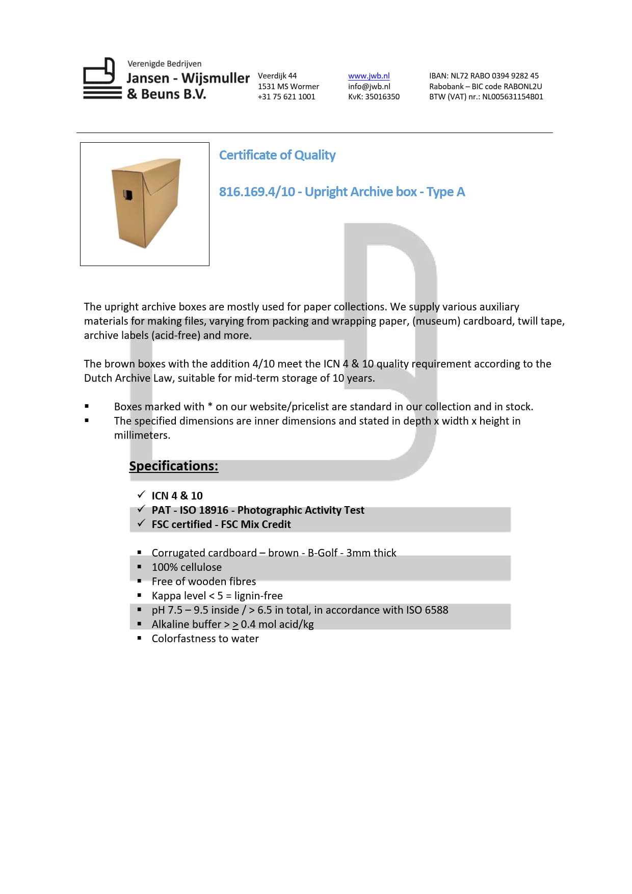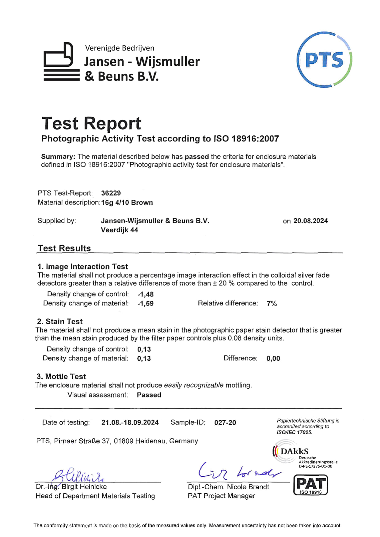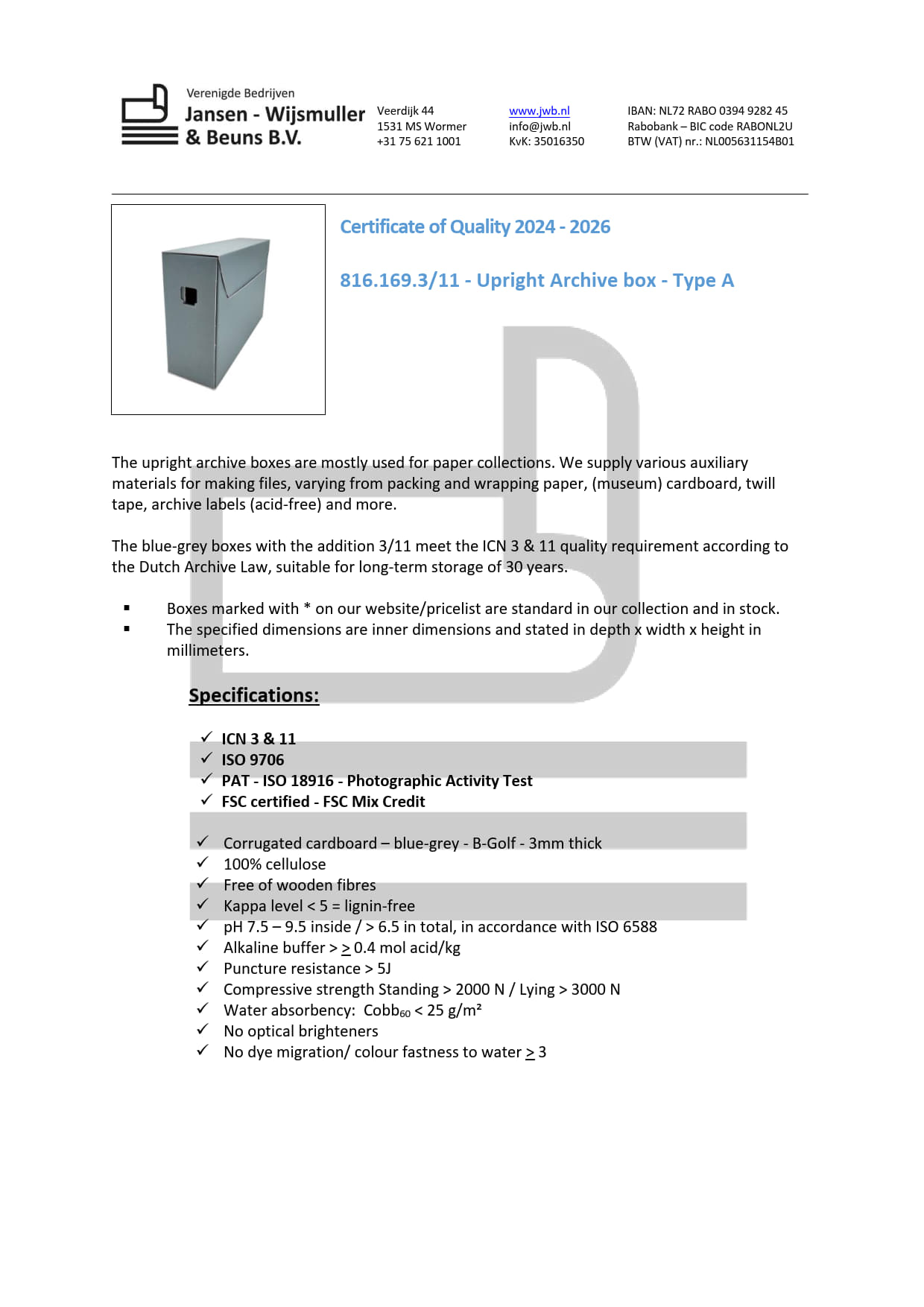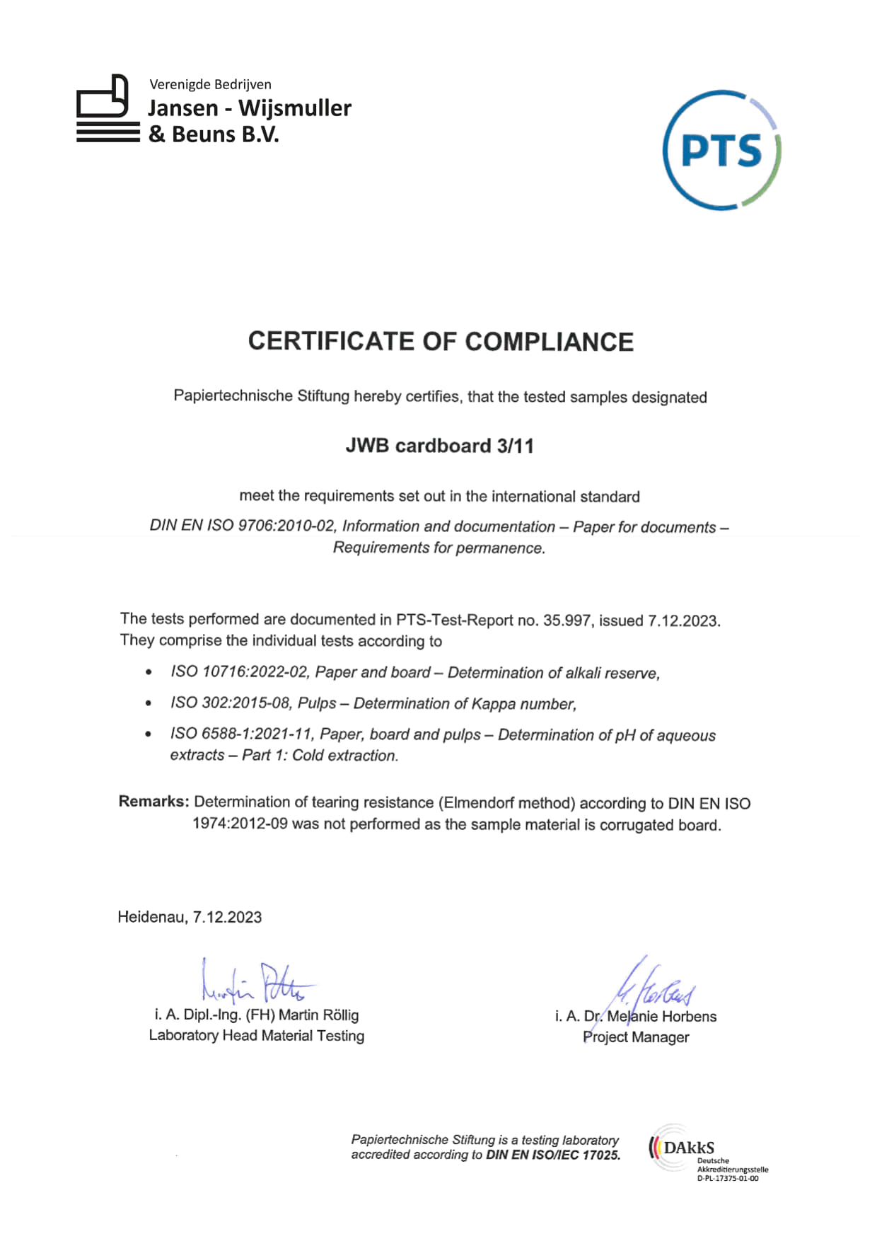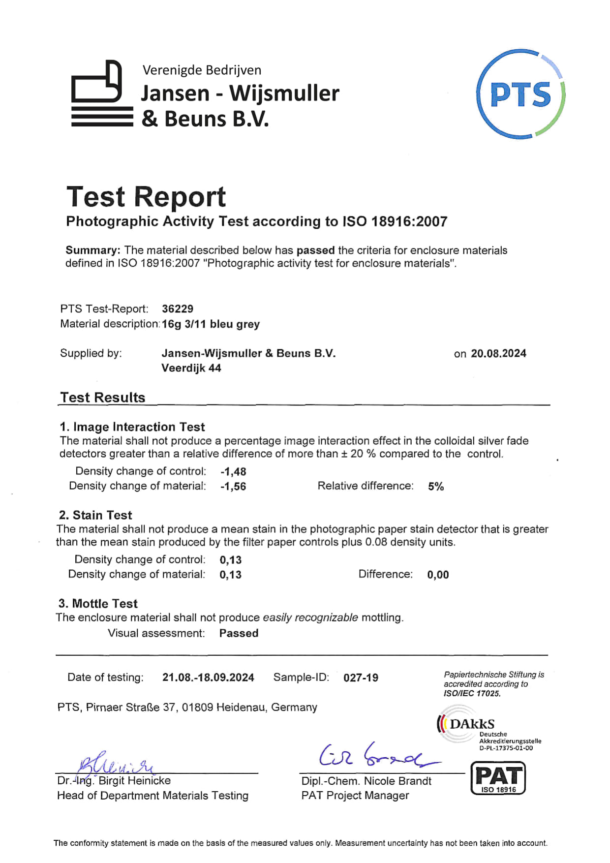 Naast deze certificering zijn onze archiefverpakkingen ook goedgekeurd volgens ISO 18916 - ook wel PAT-test. Mocht u opzoek zijn naar een internationale standaard, dan raden wij u onze blauwgrijze archiefverpakkingen aan, deze zijn goedgekeurd op ISO 9706.